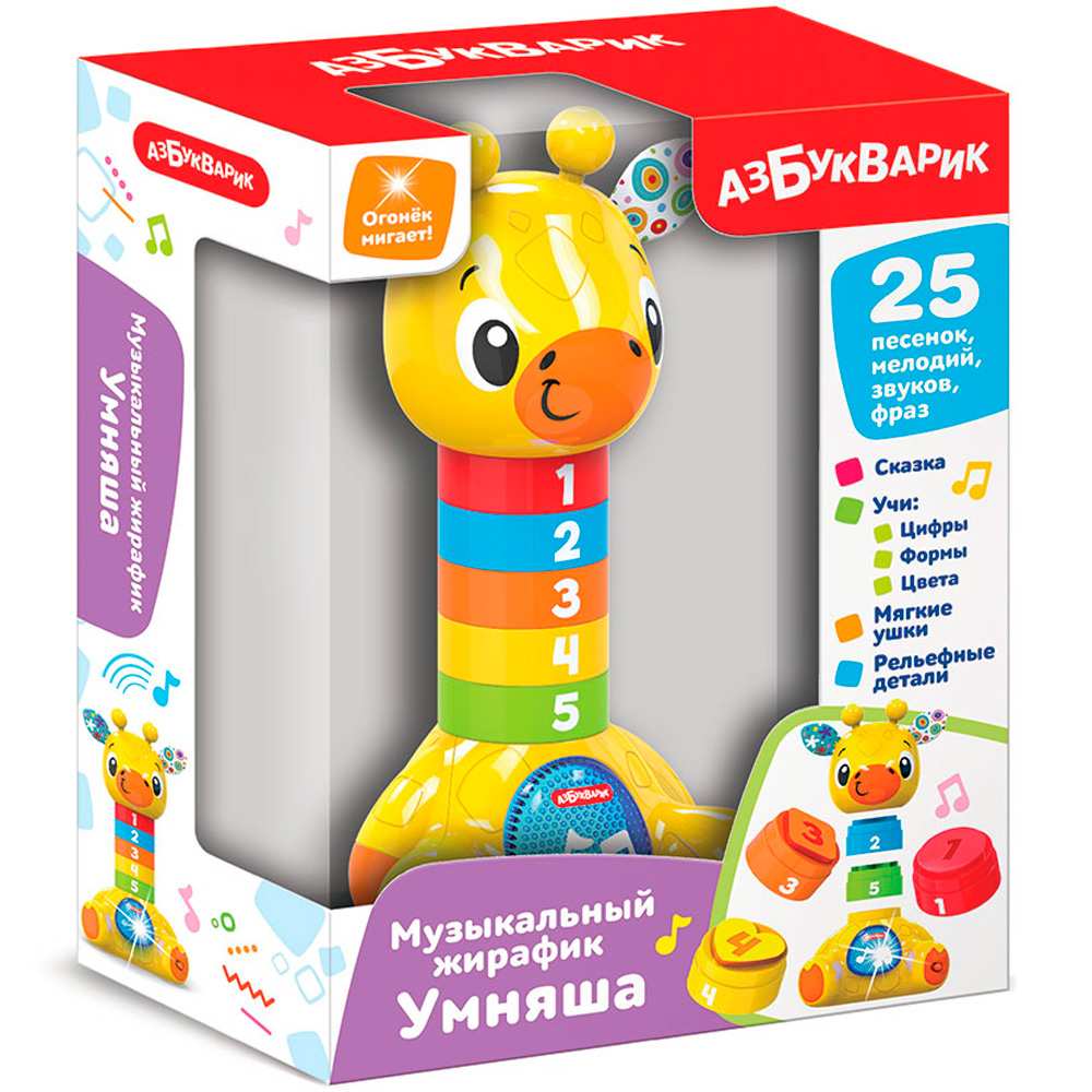 Нажимая на кнопочку с огоньком, ребенок послушает интересную сказку «Жирафик в цирке», 5 песенок («Как много игрушек на свете!», «Как хорошо уметь счита