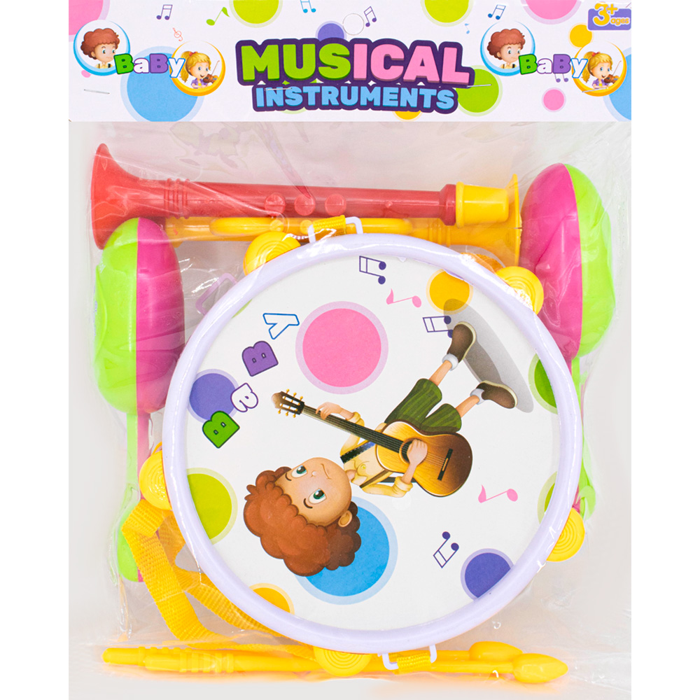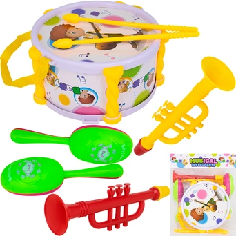 Комплектация: барабан - 1 шт, палочки - 2 шт, погремушки - 2 шт, труба - 2 шт