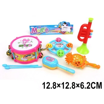 Комплектация: барабан - 1 шт, палочки - 2 шт, погремушки - 3 шт, труба - 1 шт