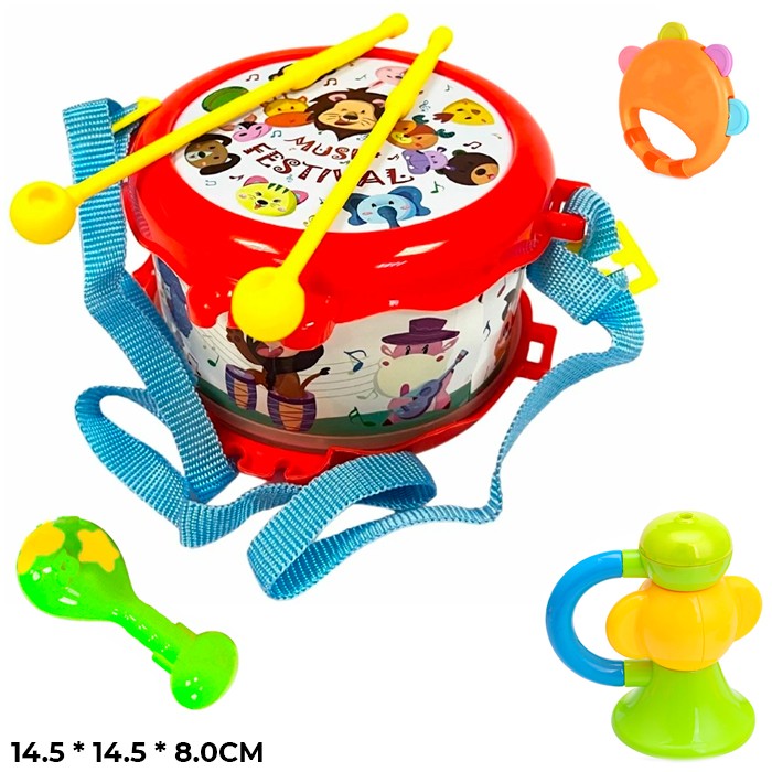 Комплектация: барабан - 1 шт., ремень для барабана - 1 шт., палочка для барабана - 2 шт., маракас - 1 шт., бубен - 1 шт., дудочка - 1 шт.
