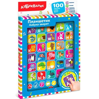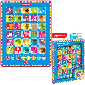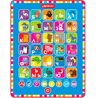 Планшет оснащен кнопками, нажимая на которые малыш сможет услышать различные звуки и мелодии, а еще познакомиться с буквами русского алфавита.
