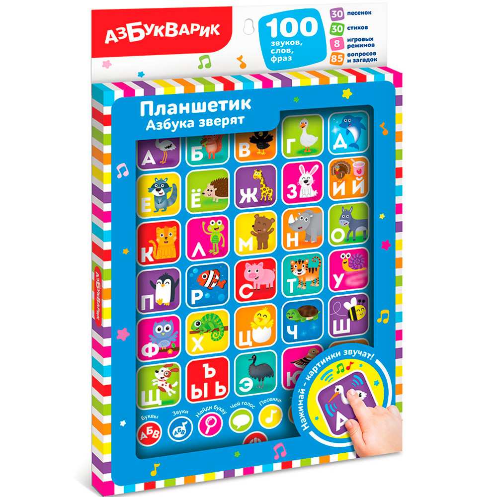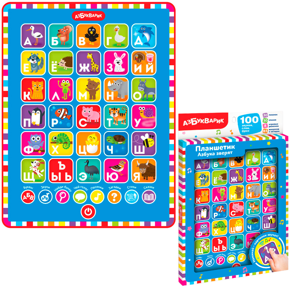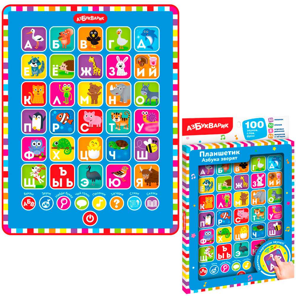 8 игровых режимов: «Буквы», «Звуки», «Найди букву», «Чей голос», «Песенки», «Загадки», «Стихи», «Сказки». 30 стихов (азбука в стихах) помогут лучше запомнить буквы, а 85 вопросов и загадок – проверить знания.
