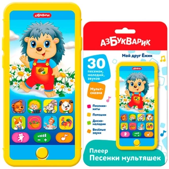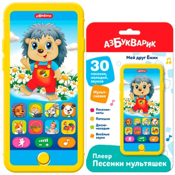 Воспроизводит сказку «Пых» и известные песенки и потешки («Облака», «Медвежонок – лучший друг», «Топ-топ-топ», «Антошка», «Пляшут весело детишки», «Зайка на лужайке», «Зарядка», «Питомцы», «Пропала собака», «Калинка», «Во саду ли в огороде», «Петушок», «Каравай» и др.), а также танцевальные мелодии и забавные звуки.