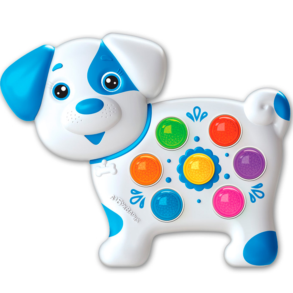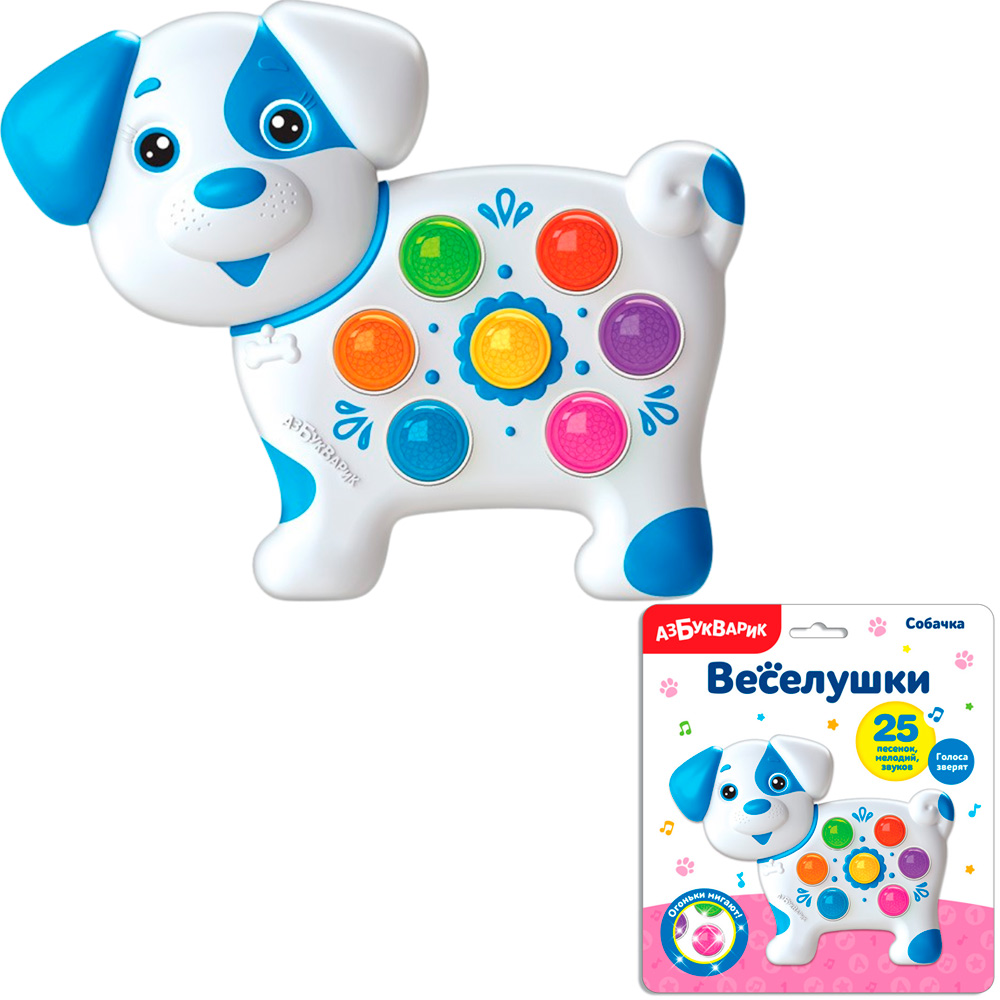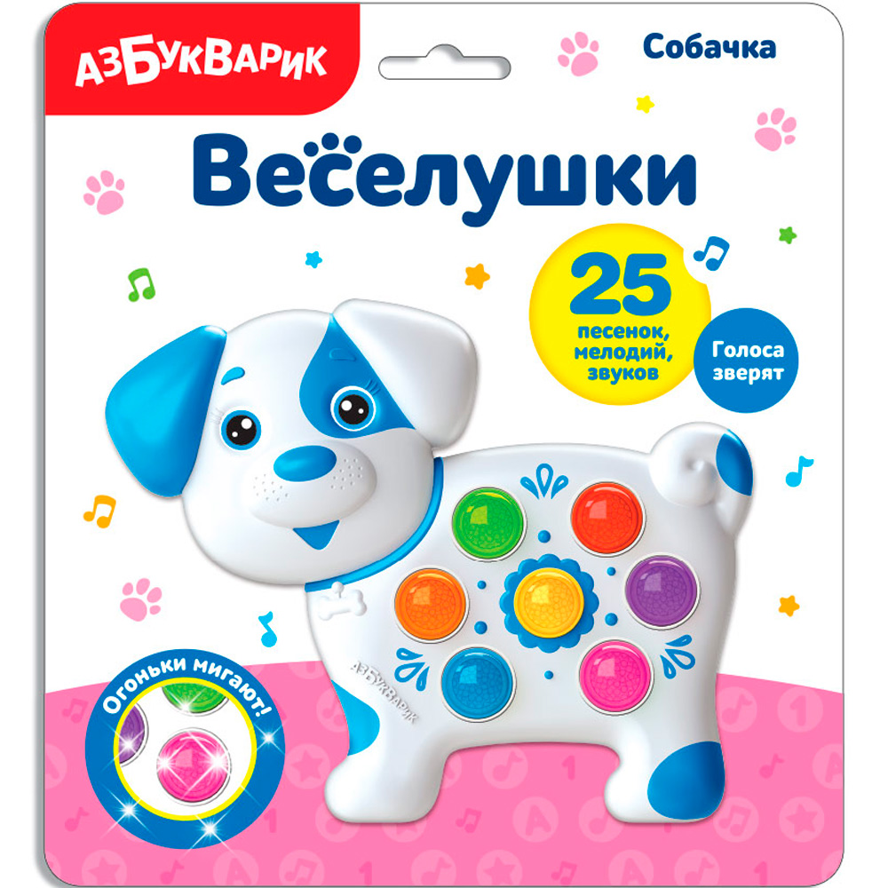 Игрушка проигрывает песенки и мелодии ("Я собачка", "У бурёнки есть телёнок...", "Я - маленький щенок", "На ферме весело живётся", "Питомцы", "Очень разные друзья бывают", "Собачий вальс", "Вдоль по Питерской" и др.), веселые звуки и голоса зверят.