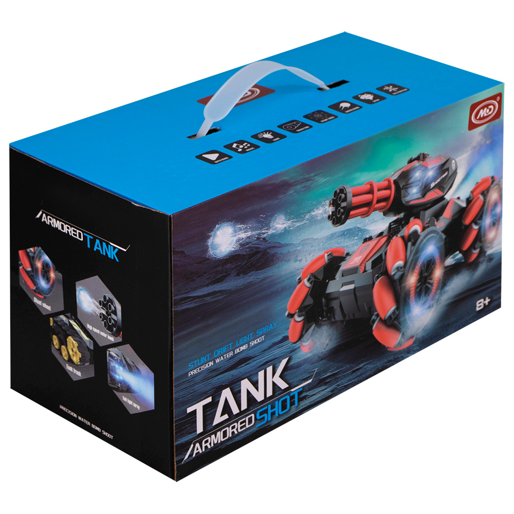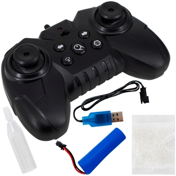 Комплектация: машинка - 1 шт, пульт управления - 1 шт, аккумулятор - 1 шт, пакет полимерных шариков 7мм - 5 шт, бутылочка для воды - 1 шт, инструкция - 1 шт, кабель для зарядки -1 шт