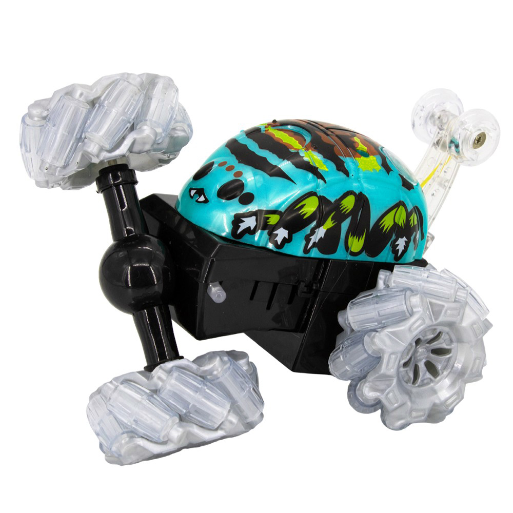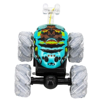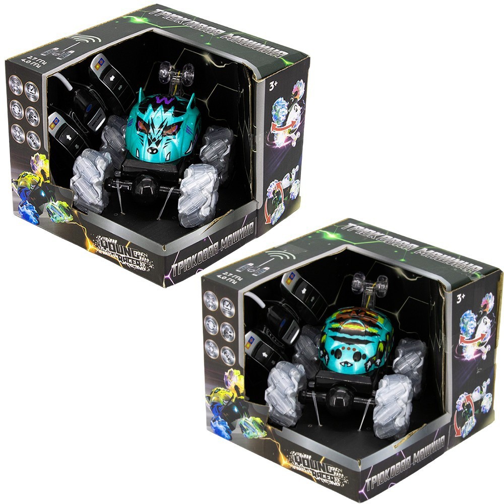 Машина имеет современный, уникальный дизайн с ярким принтом. Корпус надёжный и ударопрочный, поэтому не бойтесь преодолевать опасные препятствия, сметая всё на своем пути. Большие, цепкие колёса способны проехать любое бездорожье. Одно из ключевых особенностей является, что машина может практически выполнять акробатические трюки – вращаться по часовой и против часовой стрелки, а также совершать поездку на задних к