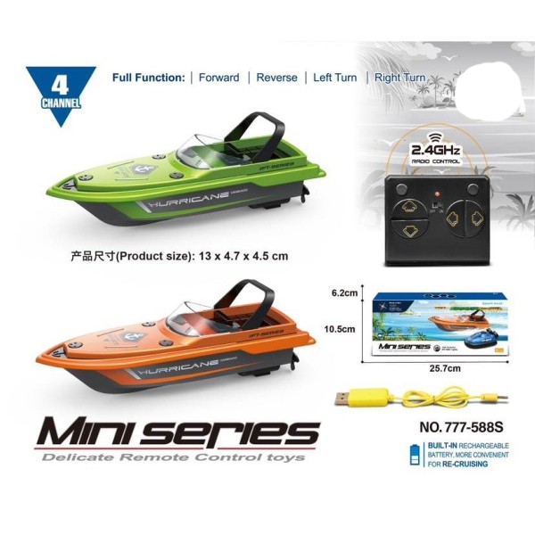 Комплектация: катер, пульт, инструкция, шнур для зарядки, 2 запасных винта