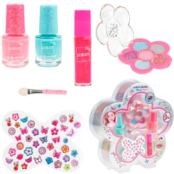 Комплектация: крем-тени с блёстками в шести оттенках, аппликатор, два детских лака для ногтей в двух оттенках — бирюзово-голубой и розовый, блеск для губ розового цвета, лист с наклейками для ногтей