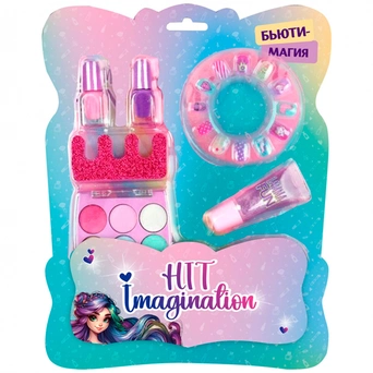 - Комплектация: блеск для губ — 1 шт., лак для ногтей — 2 шт., накладные ногти — 10 шт., разделитель для пальцев — 1 шт., тени для век — 6 цв.
