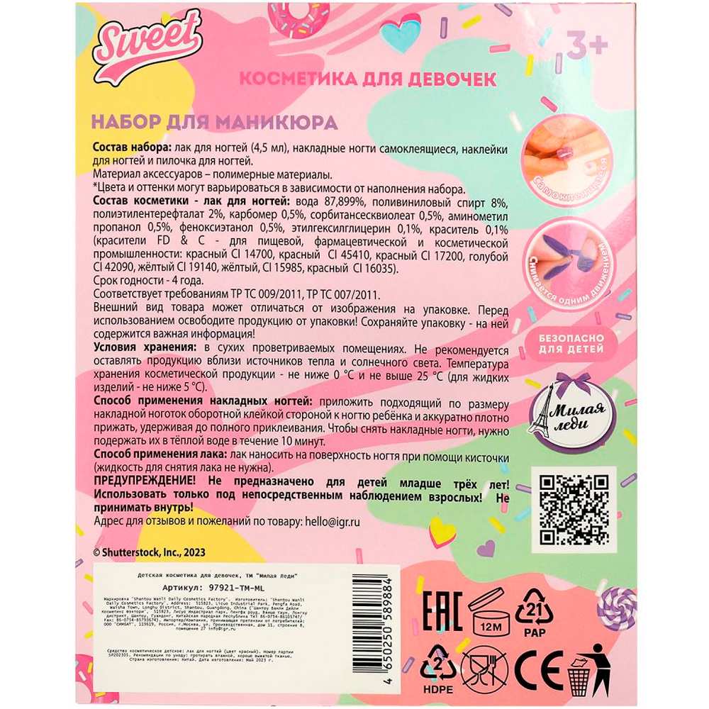 Комплектация: лак - 1 шт., пилка - 1 шт., наклейки, ногти накладные