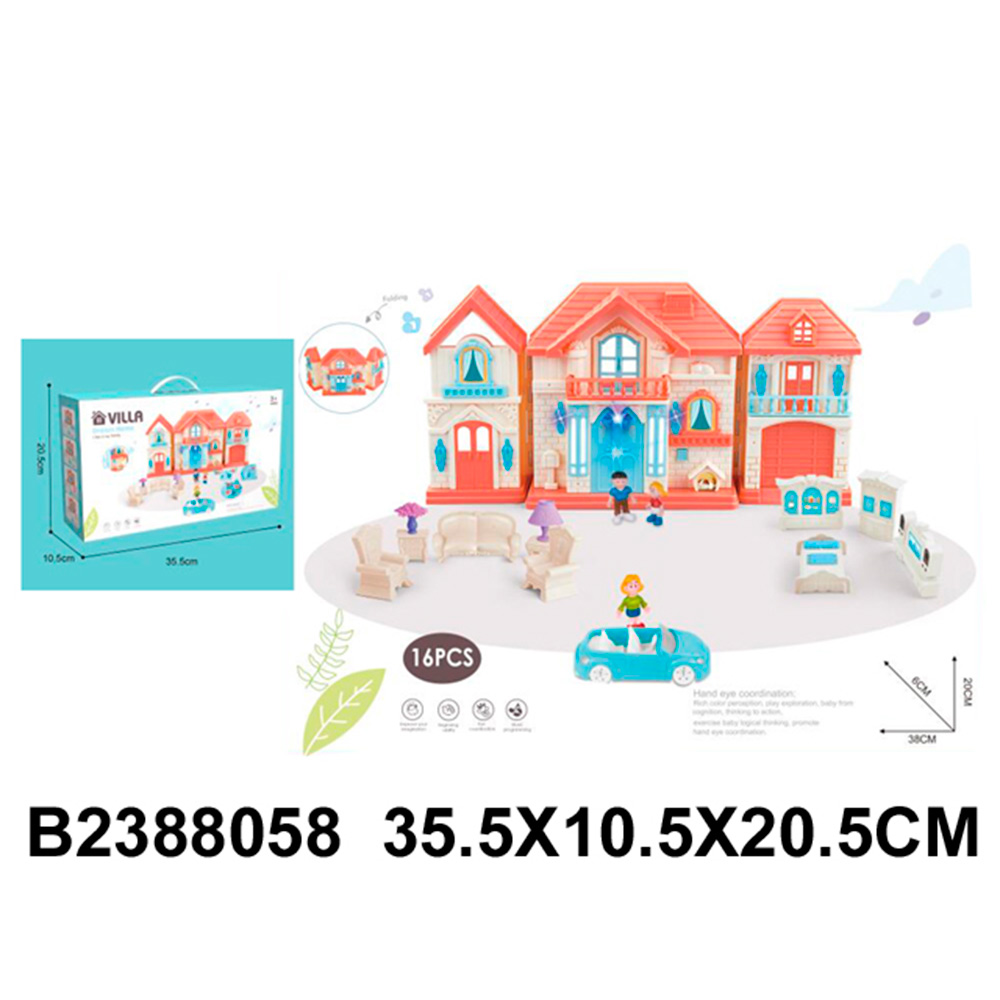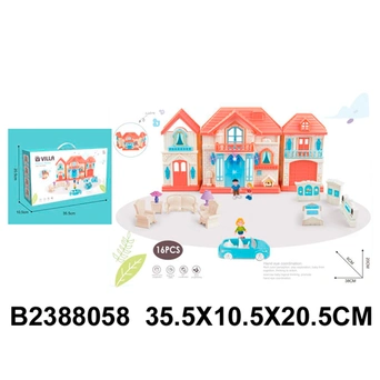Комплектация: кукольный дом - 1 шт, мебель для дома - 10шт, кукла - 3 шт, машинка - 1 шт, собачья будка - 1 шт
