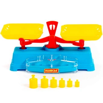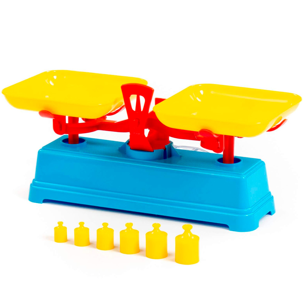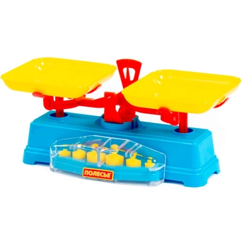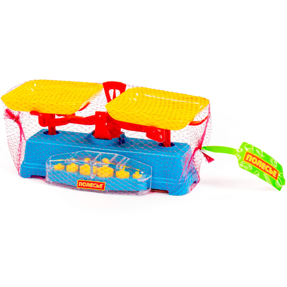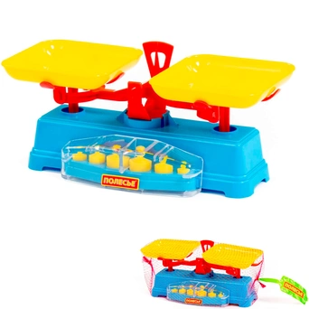 Игрушка размером 28х13х12,7 см сделана из пластика. В комплекте: весы с двумя лотками и шесть грузов разного веса. Весы упакованы в сетку. Страна производства — Беларусь.