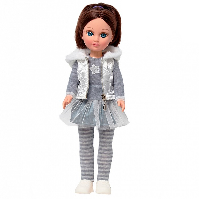 Анастасия Весна 8 выполнена в образе девочки подростка и выглядит весьма стильно. Она одета в вязаный джемпер с аппликацией, юбку из трикотажа и сетки, простроченный жилет с капюшоном, теплые лосины в полосочку и туфли. Кукла имеет вставные закрывающиеся глаза, руки и голова выполнены из качественного винила, туловище и ноги - из пластмассы. При нажатии на звуковое устройство, расположенное на спинке, кукла произносит следующие фразы: