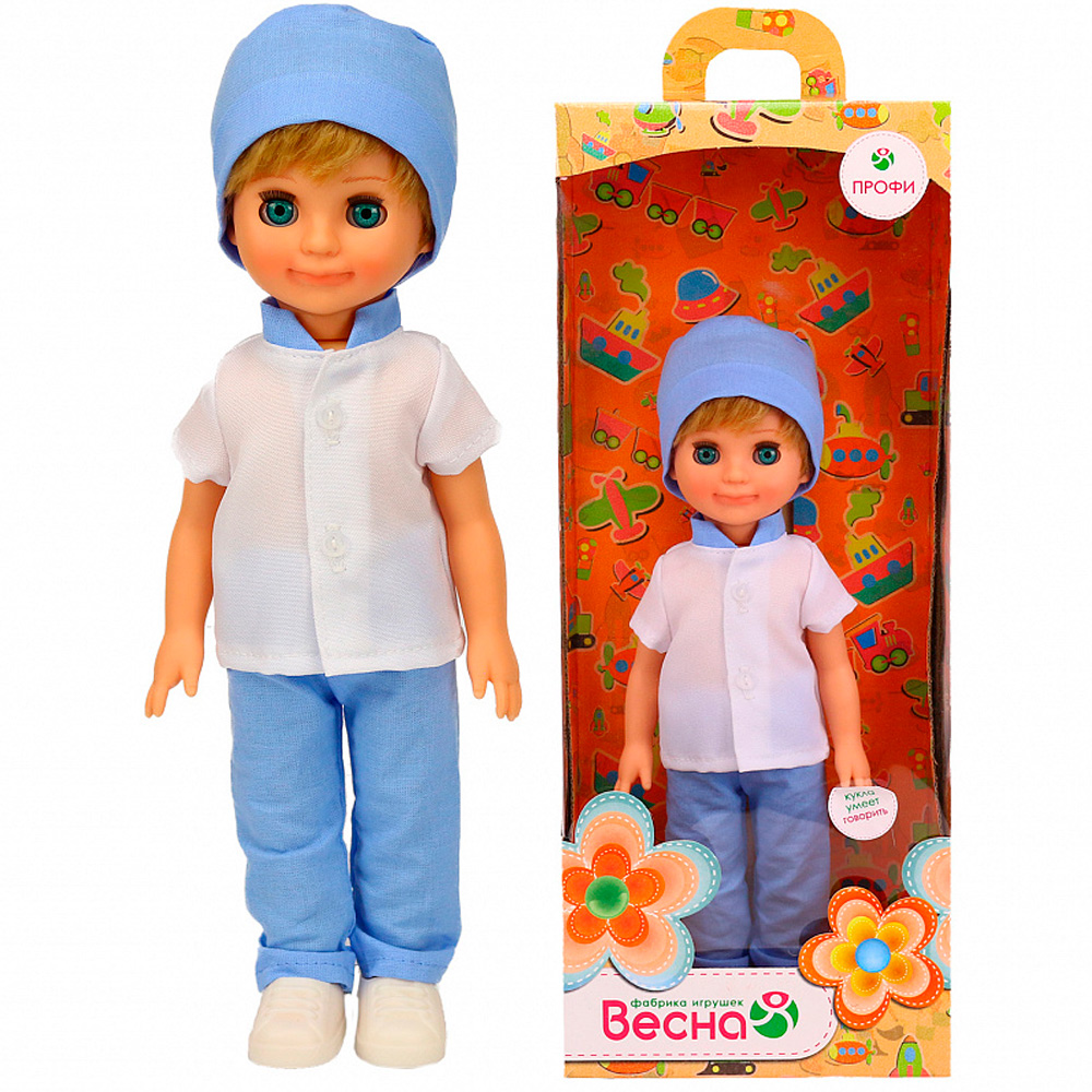 Кукла-мальчик в костюме доктора подойдет для различных сюжетно-ролевых игр и познакомит ребенка с профессией врача. Доктор одет в рубашку, брючки, шапочку и трусики, на ногах - удобные кроссовки. Ручки и голова куклы выполнены из пвх-пластизоли, тело и ножки - из пластика, волосы прошитые из нейлона, глаза вставные закрывающиеся, ручки и ножки подвижны. Игрушку можно садить, переодевать, придавать ей различные положения, что разнообразит игровые сюжеты. Звуковые устройства отсутствуют.