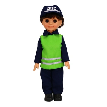 Кукла-мальчик в костюме постового ДПС подойдет для различных сюжетно-ролевых игр и станет хорошим другом для ребенка. Постовой одет в кепку, кофту, жилетку, брюки, кроссовки и трусики, форма имитирует настоящую одежду сотрудников ДПС. Ручки и голова куклы выполнены из пвх-пластизоли, тело и ножки - из пластика, волосы прошитые из нейлона, глаза вставные закрывающиеся, ручки и ножки подвижны. Игрушку можно садить, переодевать, придавать ей различные положения, что разнообразит игровые сюжеты. Звуковые устройства отсутствуют.