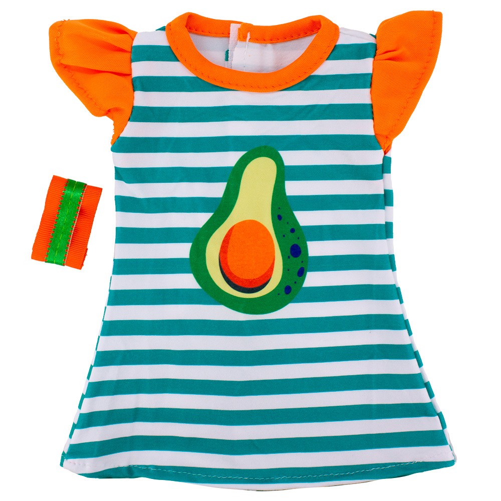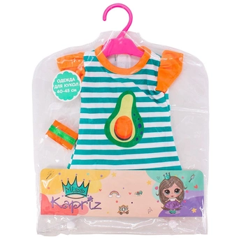 Платье для пупса Miss Kapriz станет прекрасным подарком для маленькой принцессы и её любимых кукол! Платье в яркую полоску с модным принтом авокадо.