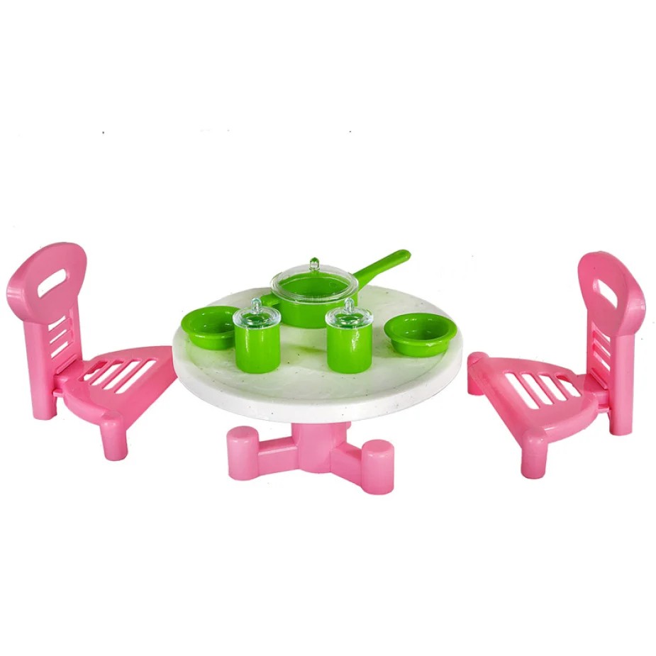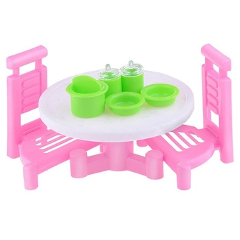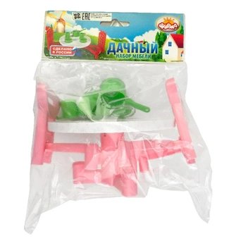 Размеры упаковки-14x14x7смЛюбой девочке хочется, чтобы у ее кукол было как можно больше аксессуаров для интересных и увлекательных игр. Яркая мебель с комплектом посуды станет прекрасным подарком для Вашей малышки! В «Дачный» комплект входит: стол круглый, 2 стула, 5 предметов посуды. Набор подходит для кукол ростом до 15 см.
