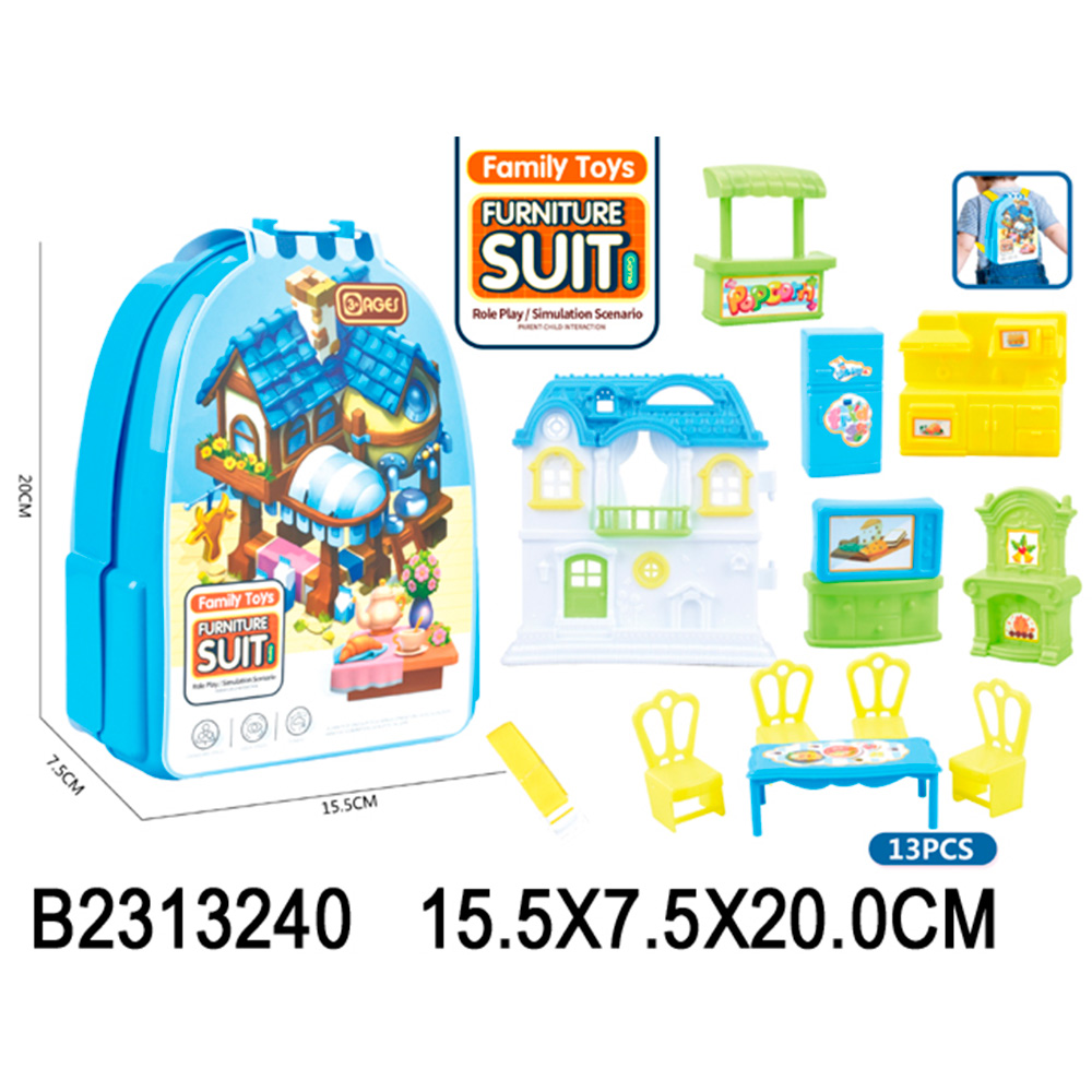 Комплектация: дом - 1 шт, стол - 1 шт, стул - 4 шт, холодильник - 1 шт, кухня - 1 шт, камин - 1 шт, микроволновая печь - 1 шт, комод - 1 шт, фруктовая палатка - 1 шт