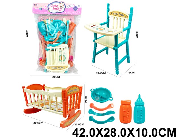 Комплектация: кроватка - 1 шт, стульчик для кормления - 1 шт, бутылочки - 2 шт, тарелка - 1 шт, вилка - 1 шт, нож - 1 шт, ложка - 1 шт