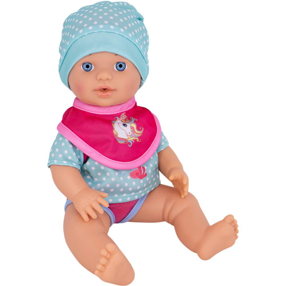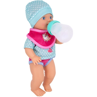 Комплектация: пупс (30 см) – 1 шт., соска-пустышка – 1 шт., бутылочка (12 х 5 х 5 см) – 1 шт., нагрудник – 1 шт.,