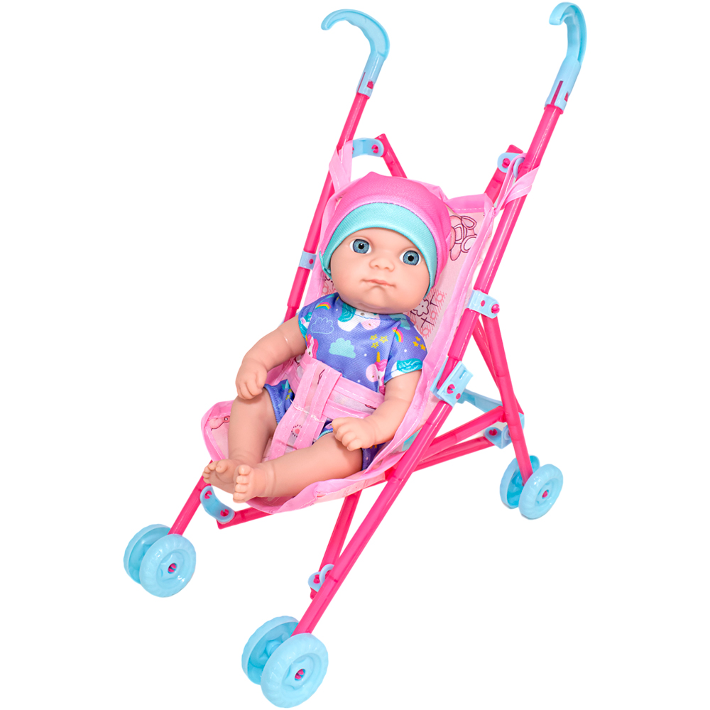 Пупс - одна из самых любимых детских игрушек. Отправляйся на прогулку вместе с малышкой, у которой есть красивая коляска - трость.