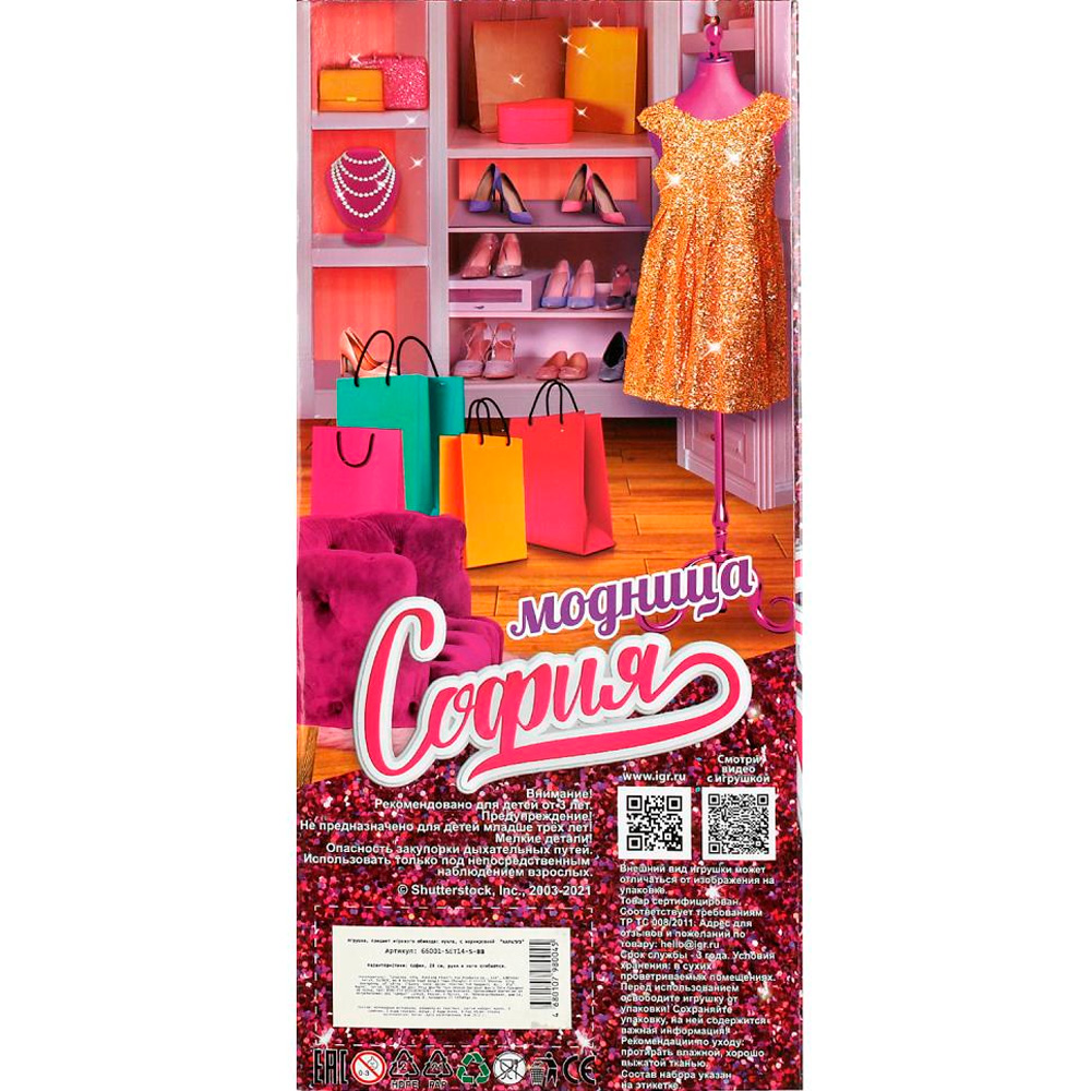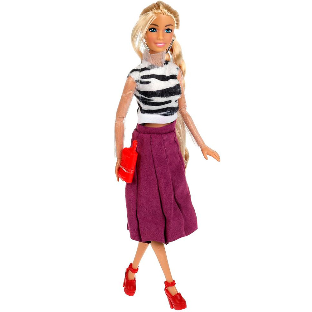Комплектация: кукла - 1 шт, 3 сумочки, 6 пар обуви, 2 пары очков, колье, серьги