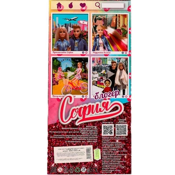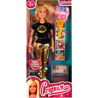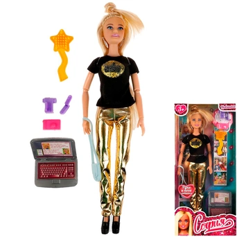 Комплектация: кукла - 1 шт, расческа - 1 шт, сумочка - 1 шт, ноутбук - 1 шт, фотоаппарат - 1 шт. телефон - 1 шт, камера - 1 шт