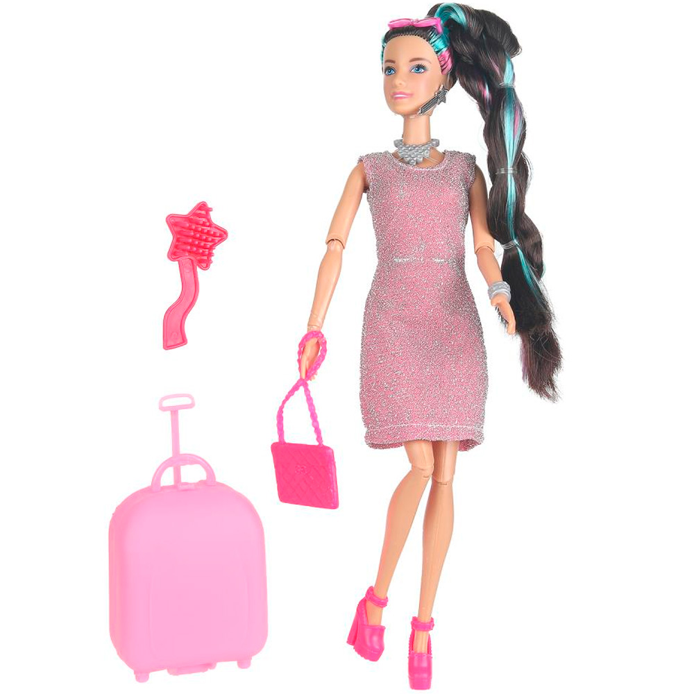 Комплектация: кукла - 1 шт, расческа - 1шт, чемодан - 1шт, телефон - 1шт, сумочка - 1шт, очки - 1шт