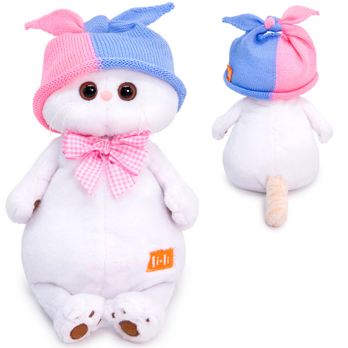 Кошечка Ли Ли в вязаной шапке из розовой и голубой пряжи с завязывающимися концами сверху. Также на Ли Ли объемный бант в бело розовую клеточку.