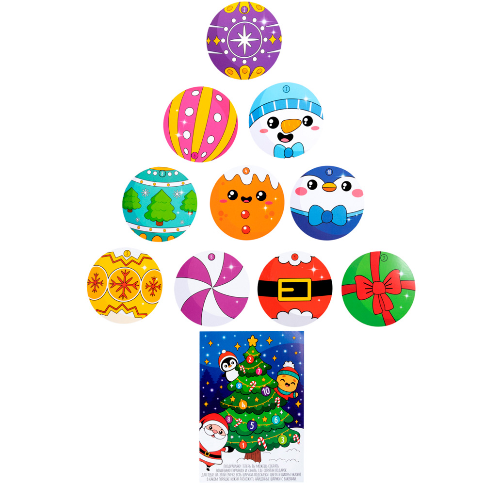 Комплектация: карточки с заданиями - 10 шт., карточки-подсказки - 10 шт.. ёлка-подсказка - 1шт., письмо Деда Мороза - 1 шт., правила