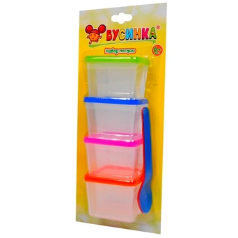 Комплектация: контейнер - 4 шт., крышка - 5 шт., ложка - 1 шт., вилка - 1шт.