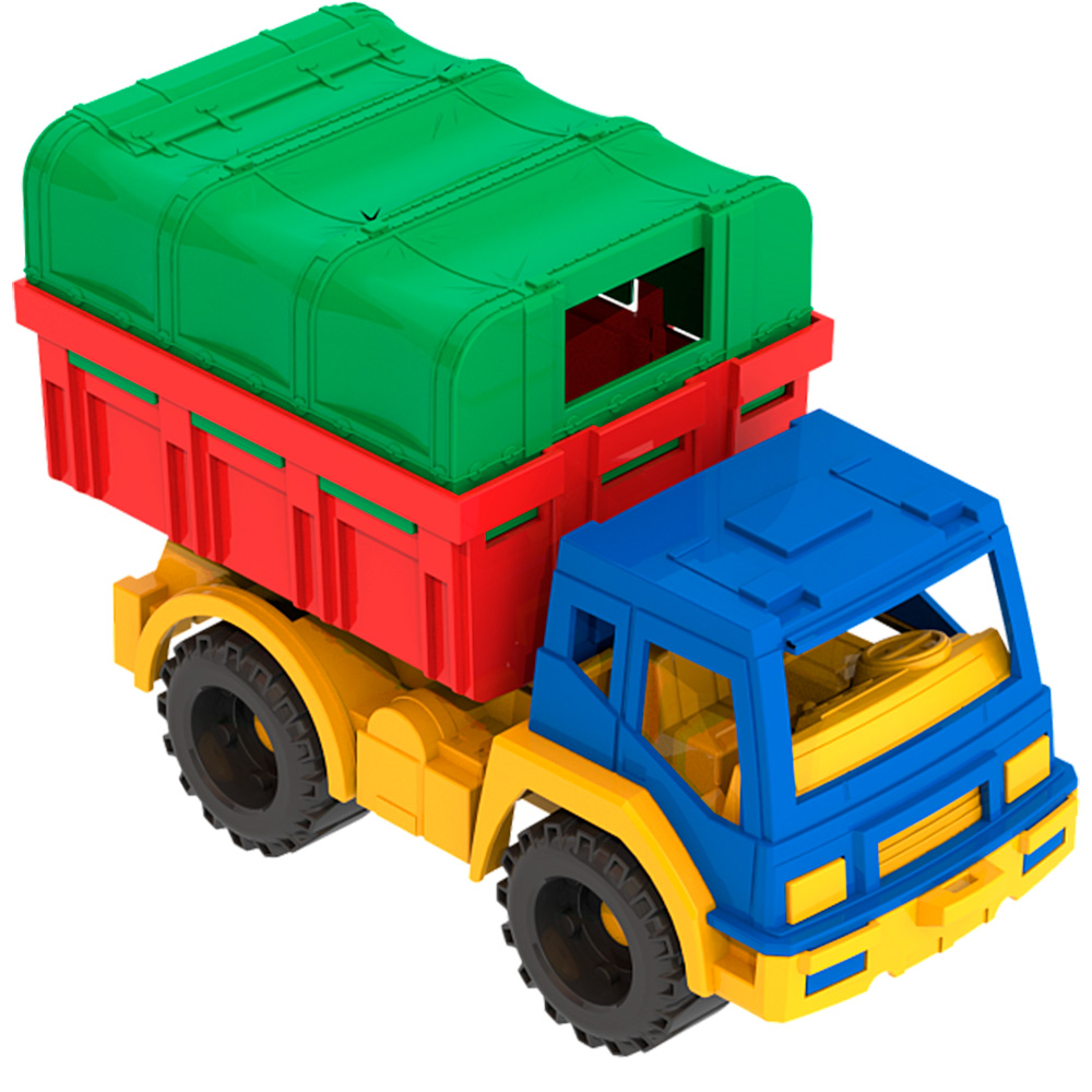 Яркая модель представляет собой копию грузовика с вместительным кузовом.