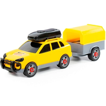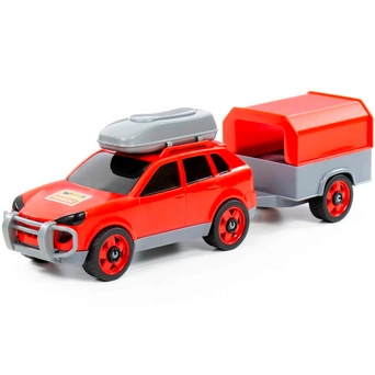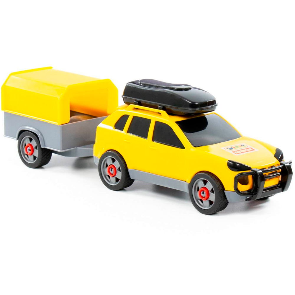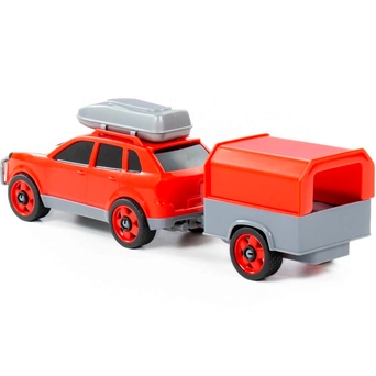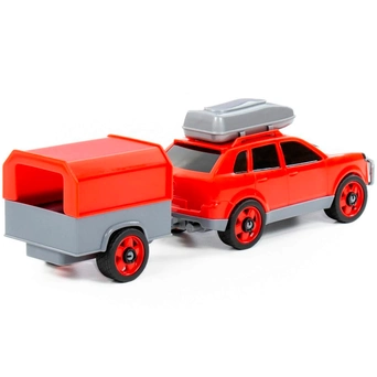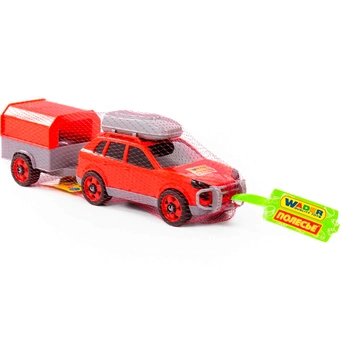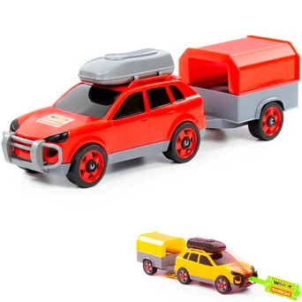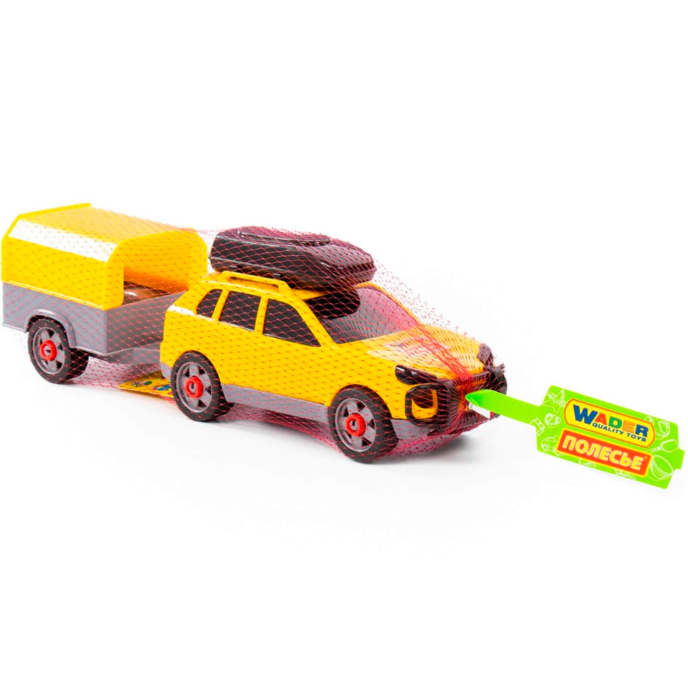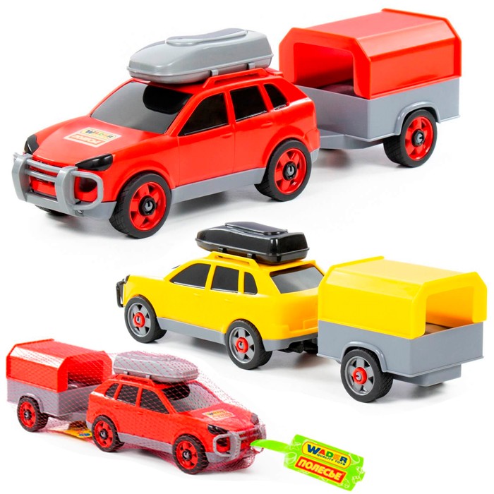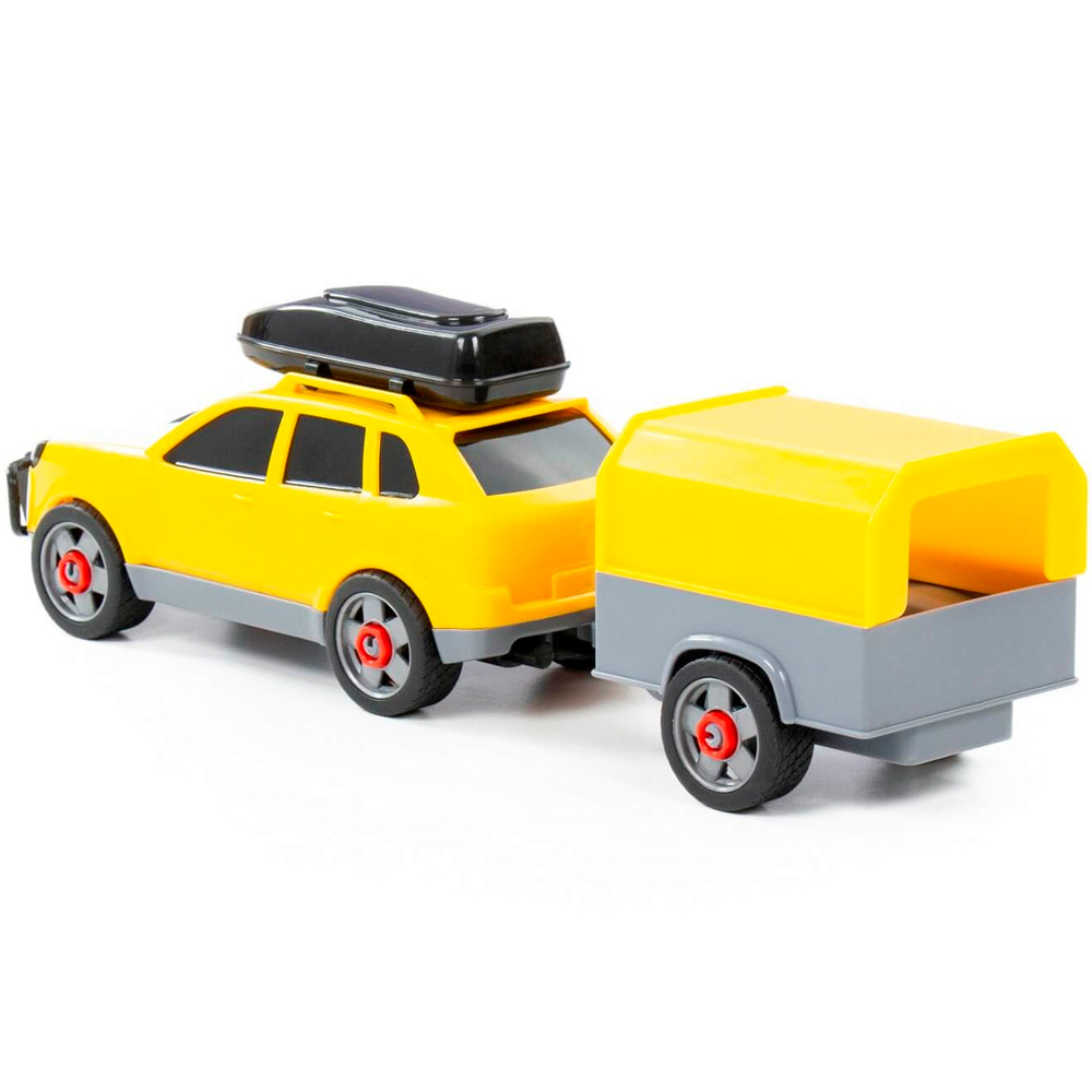 Легковой автомобиль с прицепом предназначен для увлекательных игр. Оригинальная машинка выполнена из высококачественного пластика. Яркая окраска и интересный дизайн делают машину привлекательной. Окна тонированные, на крыше дополнительный багажный отсек, вместительный прицеп позволитразместить там разные грузы. Игрушка оснащена крутящимися колесами со свободным ходом и будет хорошо кататься по ровной поверхности. Стилизация и характерный дизайн делают машину интересной для малышей, а процесс игры увлекательным. Такая модель станет прекрасным подарком маленькому любителю автомобилей, а также разнообразит игровые сюжеты. С ним можно устроить массу увлекательных игр с друзьями дома или на улице. Изделия просты в уходе и эксплуатации, прочные и долговечные, они будут долго радовать своим внешним видом.