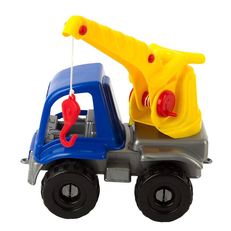 • Машинка выполнена в ярких цветах и оснащена вращающейся платформой со стрелой и механизмом подъёма крюка.