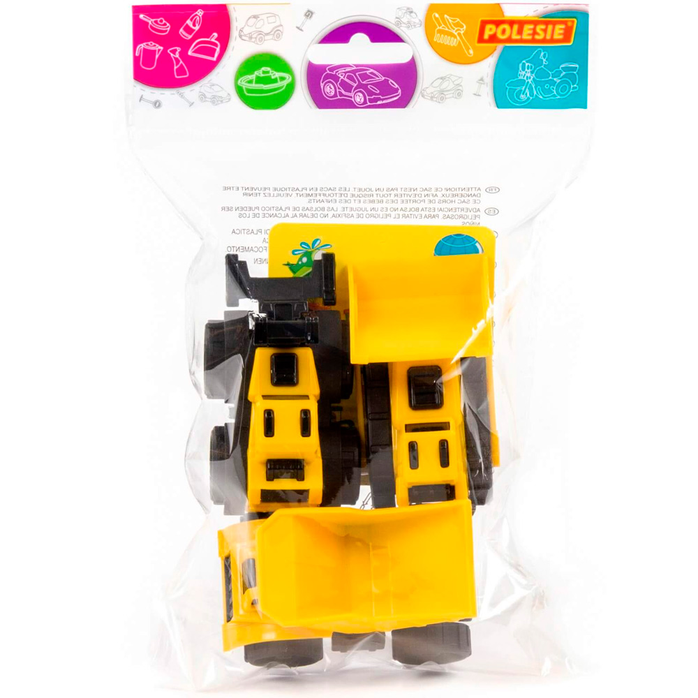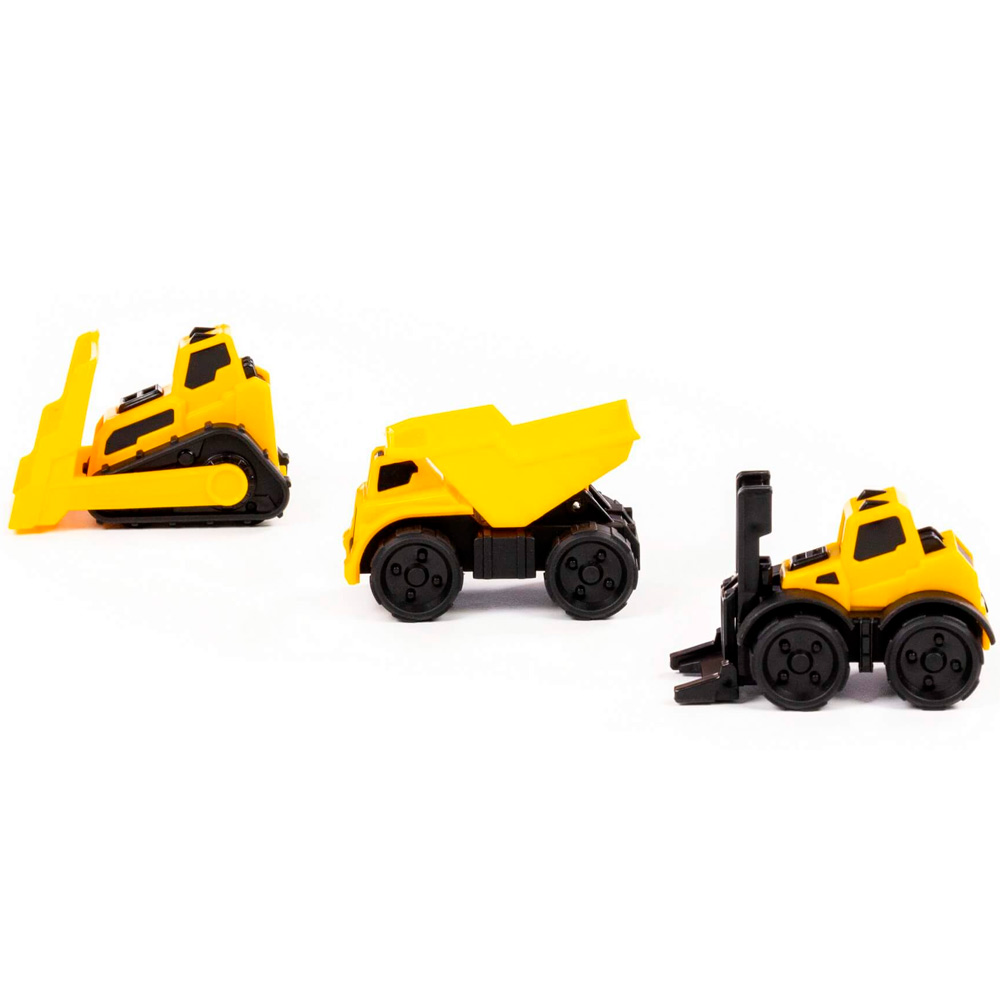 - Разнообразие: в наборе три разные машинки — самосвал, погрузчик и бульдозер. Это позволит придумывать множество игровых сценариев.