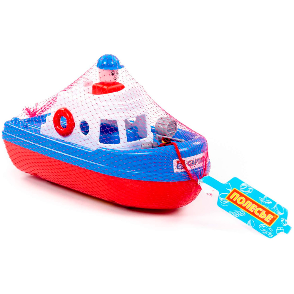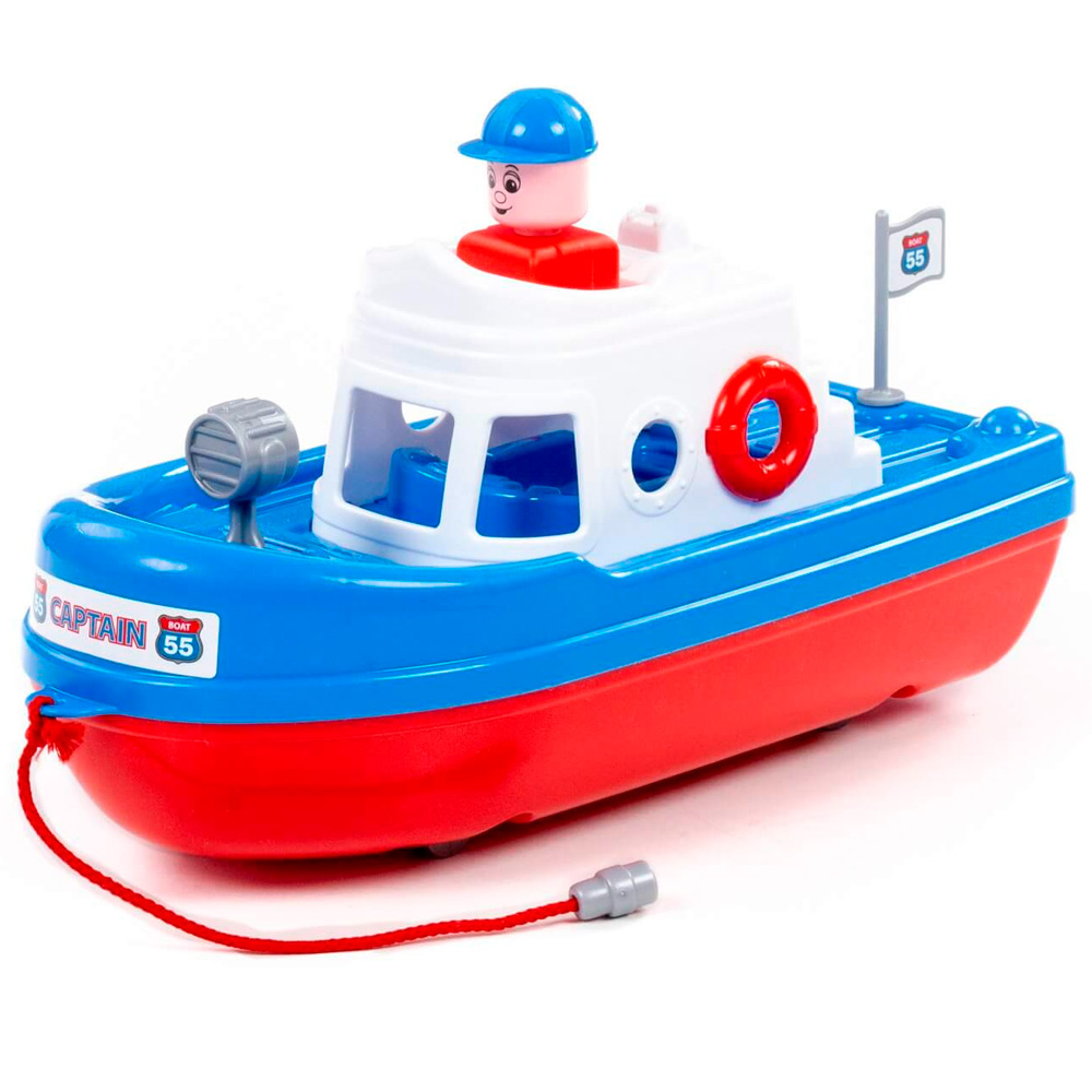 Конструкция корабля предполагает наличие верёвочки, за которую ребёнок сможет катать игрушку по воде. На кабине катера располагается фигурка человечка, которая разнообразит игру и сделает ее еще интереснее.