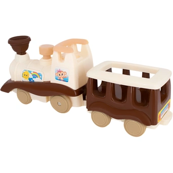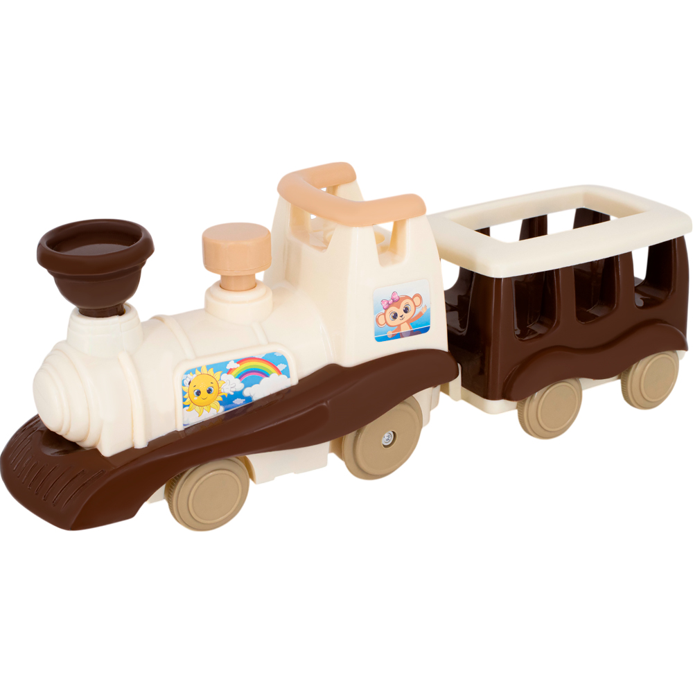 - на паровозике наклеены изображения с забавными зверятами